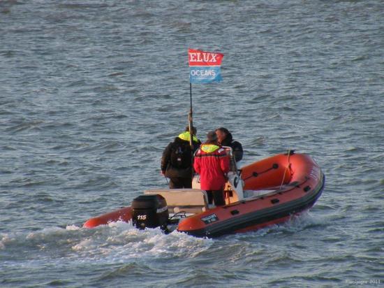 Précédés des petits bateaux de l'organisation, le Polonais et le Canadien se dirigent vers les tours marquant l'entrée du vieux port, mais vont bifurquer vers la droite pour atteindre le bassin à flot des chalutiers, dont l'entrée est enjambée par une passerelle (qui avait été restaurée il y a quelques mois).