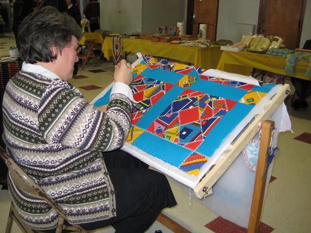 Monique Avon-Caron surpique une couverture de bébé ; elle avait confectionné les tabliers au logo de Saint-Sulpice.