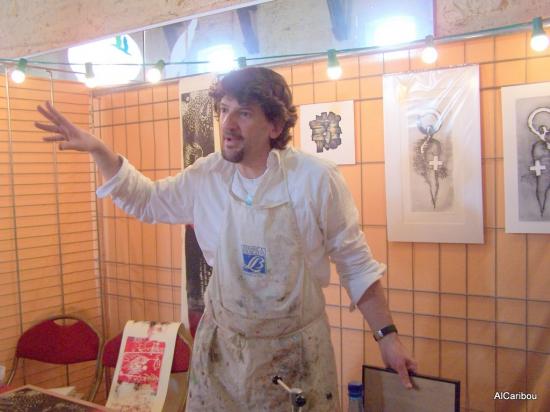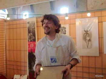 | Benoît Hapiot était bien là. Il travaille les matières. Ici il mettait autant d'encre sur son tablier que sur le papier, avec tout plein d'explications ! Il "développe un travail original sur les signes et les traces de la civilisation." |