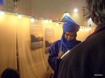 | Un touareg qu'on avait déjà rencontré l'an dernier... et repéré grâce à son chèche, turban bleu que l'on savait être typique des hommes du désert. (Nos lectures d'enfance !) Il aurait pu faire tandem avec Pierre Schmitt. |